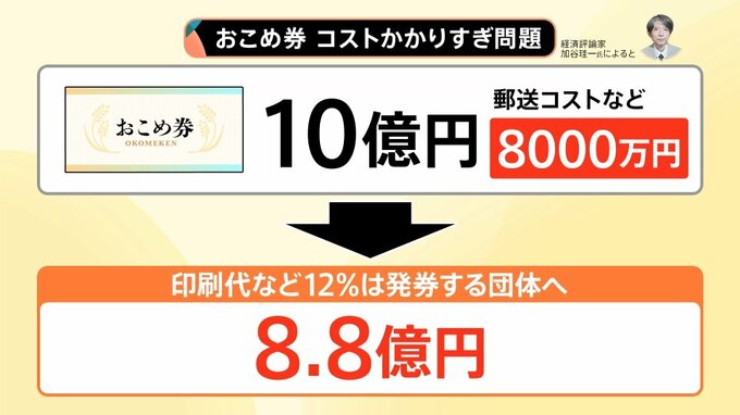 経済評論家の加谷珪一氏によると、例えば「10億円のおこめ券」が配布されたとすると、12%は印刷コストなどとして発券団体へ行くため、実際に引き換えられるおこめ券は「8億8000万円」になるということです。