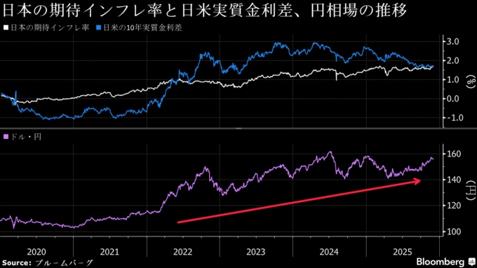 (ブルームバーグ):市場で日本の物価上昇を織り込む動きが強まる中、インフレ調整後の国債利回りが伸び悩み、円相場を下支えする力が弱まっている。