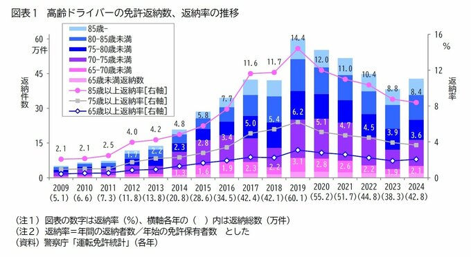 返納率で見ると、2019年に大きく上昇した後は、2023年まで低下が続いていたが、2024年は、65歳以上の返納率は前年を上回り、75歳以上の返納率は引き続き低下していた。