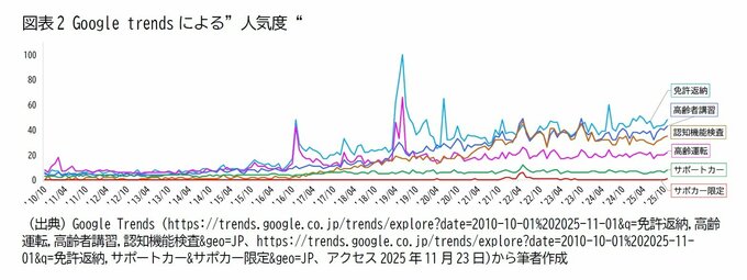 Google Trendsでウェブ検索の動向をみても、「免許返納」「高齢者講習」「認知機能検査」といった語の関心がゆっくりと上昇しているのに対し、「サポカー限定」は、導入当初に検索されただけにとどまっているようだ。