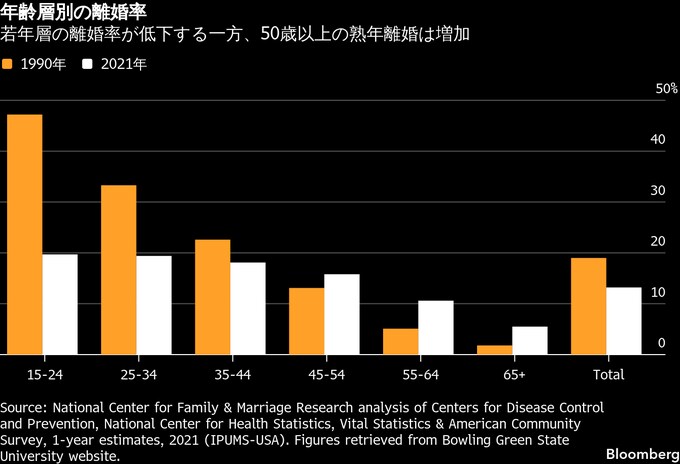 米国では若年層の離婚率が低下する一方、50歳以上の「熟年離婚」の増加が顕著となっている。65歳以上の層では1990年代以降、離婚率が上昇傾向にある。平均寿命の伸び、子供が巣立った後の空虚感、離婚に対する社会的偏見の減少に加え、再婚の場合は初婚よりも離婚率が高いことが背景にある。