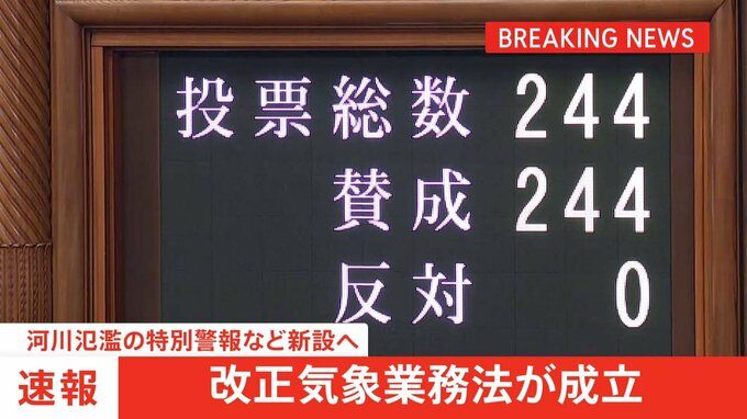 毎年甚大な被害をおよぼす豪雨災害に対応するため、河川氾濫の特別警報を設置することなどを盛り込んだ改正気象業務法などが先ほど成立しました。きょう(5日)行われた参議院本会議では、改正気象業務法と改正水…