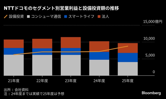 ドコモは主力である携帯電話関連のコンシューマ通信事業の不振が続く。現在のセグメント体制となってから同事業の営業利益は2024年度まで3期連続の減益で、25年度も減益の見通し。販売促進強化のための費用を増やしているほか、通信品質の改善も大きな課題で設備投資負担も増している。