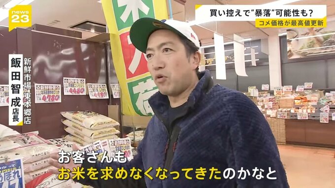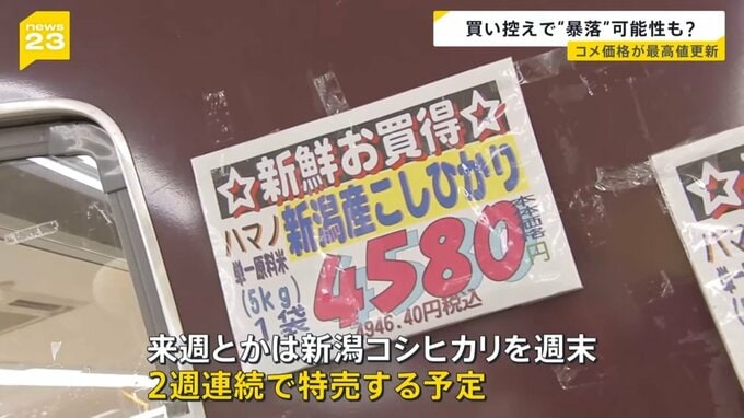 最新のスーパーでのコメの平均価格は5キロ4335円と過去最高を更新しました。コメ高騰が続き「コメ離れ」が懸念されていますが、コメ卸最大手の社長は「かなり暴落する可能性がある」との見方を示しています。あるスーパーでは値下がりの兆しともとれる動きが出ていました。