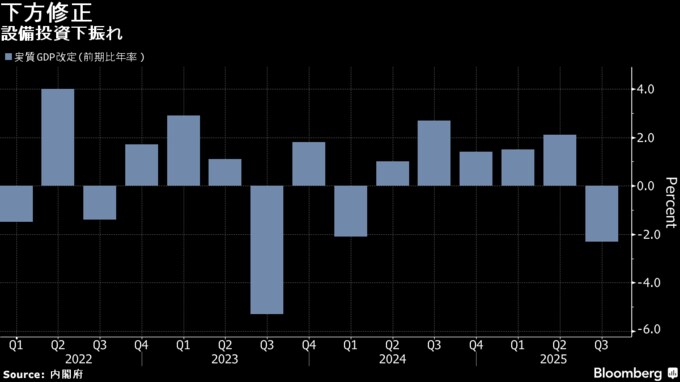 (ブルームバーグ):7-9月期の実質国内総生産(GDP)改定値は、速報値から下方修正された。設備投資の下振れが主因。6四半期ぶりのマイナス成長で、高市早苗政権の積極財政を後押しする材料となり得る。