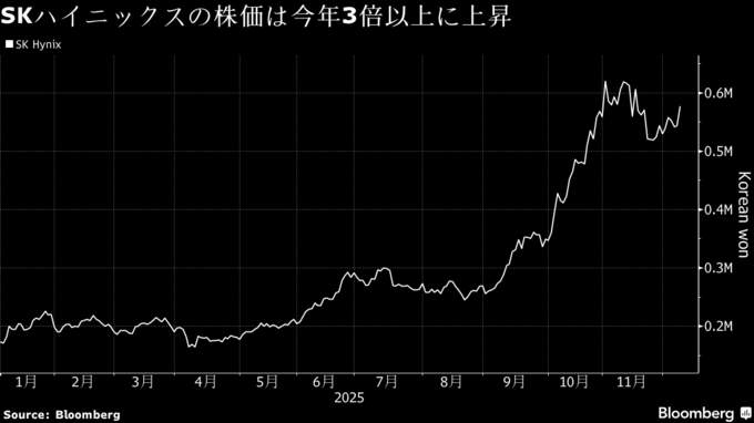 AIブームに乗じた関連企業の株価上昇が続く中、世界のハイテク株にはバブル懸念がくすぶっている。高帯域幅メモリー(HBM)でエヌビディアの主要サプライヤーであるSKハイニックスの株価は年初来で232%上昇している。
