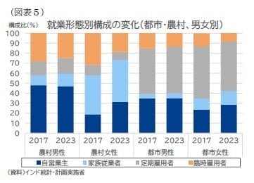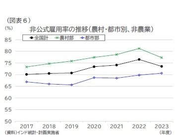 PLFSによれば、非農業部門における非公式雇用は全国平均で70~75%に達し、農村部で約8割、都市部でも6~7割の労働者が社会保障の適用や書面での雇用契約など、制度的保護の対象外に置かれている。