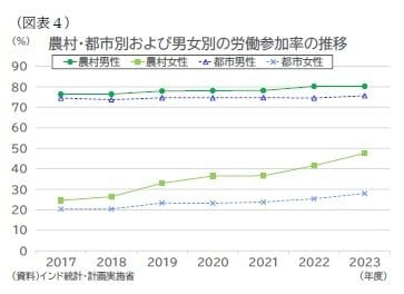 農村女性の労働参加率は2017年度の24.6%から2023年度には47.6%へ上昇した一方、都市女性では20%台にとどまる。男性はいずれの地域でも横ばいであり、近年の変化は主として女性によるものである。