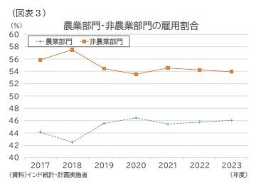 非農業部門の雇用割合は2018年度の57.5%をピークに2023年度には53.9%へ低下しており、産業転換の鈍化が明確になっている。雇用の量的な拡大が続く一方で、質的な改善は依然として限定的である。