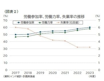 定期労働力調査(Periodic Labour Force Survey:PLFS)によれば、労働参加率は2017年度の49.8%から、2023年度には60.1%へ上昇し、失業率も同期間に6.0%から3.2%へと低下した。