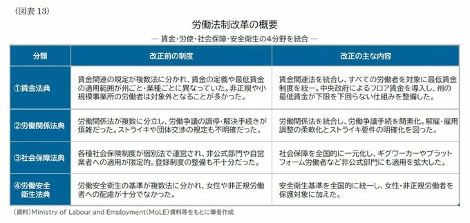 このように、労働法典の施行は制度基盤の近代化に向けた重要な一歩ではあるものの、社会保障の実効的な拡大には、州レベルの体制整備や企業側の運用負担の軽減など、多くの課題が残されている。