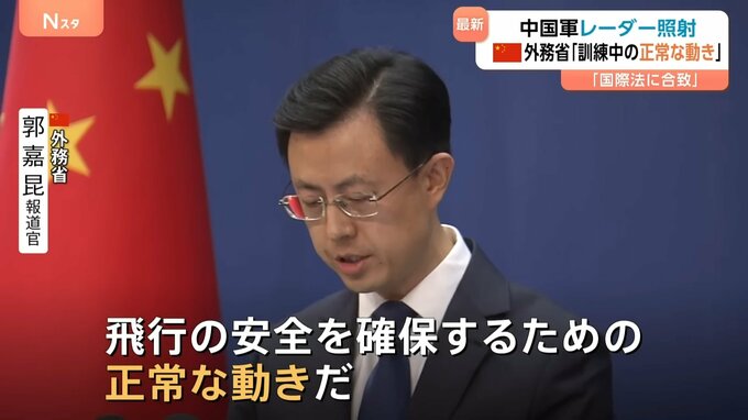 中国外務省の郭嘉昆報道官は9日の記者会見で報道陣から断続的に照射したのかと問われたのに対し、「中国側が関連海域・空域で演習活動を実施したことは、国際法及び国際的な慣例に合致する」と改めて主張しました。