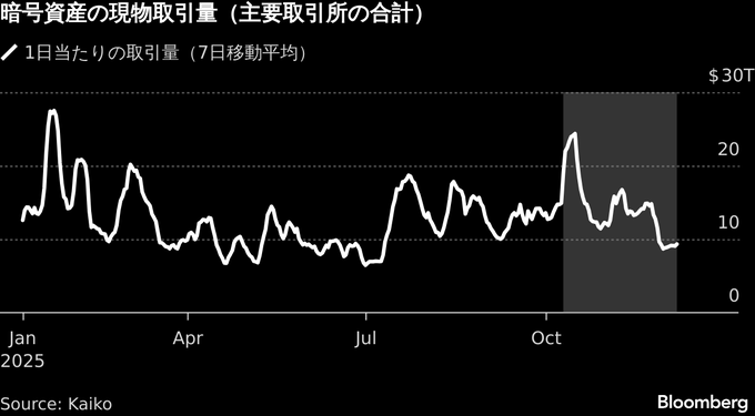 弱地合いが続く背景には流動性の低下がある。データ提供会社カイコによれば、主要取引所での現物取引量は1月のピークから66%減少。同様に、市場が大口取引を大きな価格変動なく吸収する能力を示す市場厚み(マーケットデプス)も、ビットコインとイーサの双方で今年の高水準から約30%低下した。