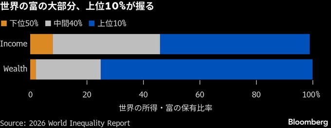 世界の富は「歴史的な高み」に達したものの、その分配は依然として「極めて不均衡」で、世界の個人資産と総所得の最大部分を保有するのはトップ10%の富裕層だと研究者らは指摘。不平等の是正に向け、累進課税や移転支出の活用を各国政府に提言した。