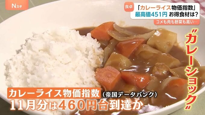 「家で作ったら、(1食)180円ぐらいで全然できるんじゃないですか。(Nスタ:いま、451円)うわ!そんなにするんですか。野菜も、ジャガイモとか高いですし、そう言われたらそうかな」