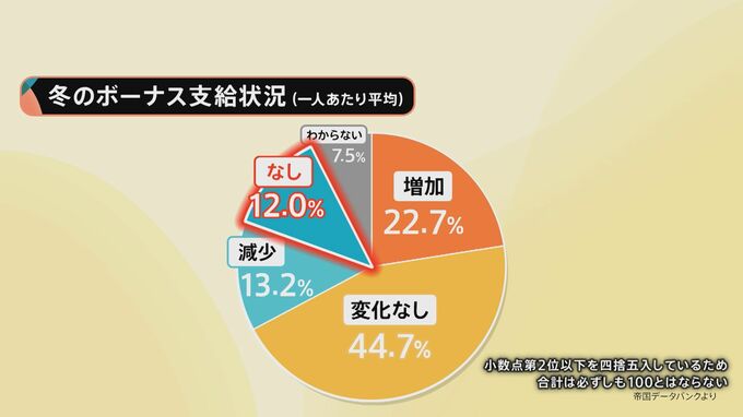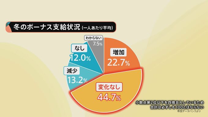 帝国データバンクの2025年の冬のボーナスに関する調査によると、支給額は「変わらない」と答えた企業が約半数、2割の企業は「増加する」としています。