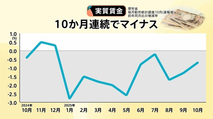 実質賃金は10か月連続でマイナスです。やはり物価が高いので、給与が少し上がっただけでは苦しいということですね。