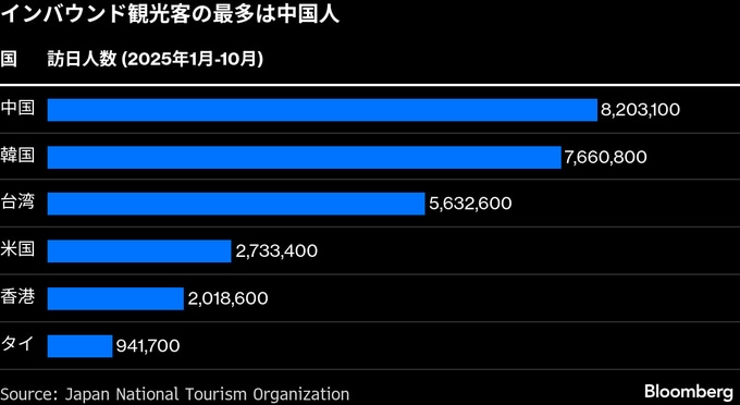 中国人旅行客は7-9月期の訪日外国人旅行消費額の約3割を占め、最大のインバウンド消費主体だった。チャイナ・トレーディング・デスクによると、日中関係悪化に伴う中国からの訪日旅行のキャンセルにより、年末までに日本が被る経済損失は最大12億ドル(約1900億円)に達する可能性がある。