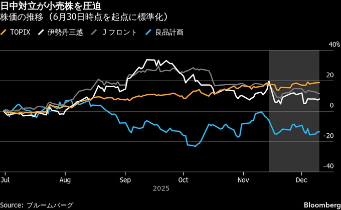 こうした状況下で、インバウンド需要拡大への期待から今年の有望株とされていた百貨店や、中国観光客に人気の小売株に対する逆風が強まっている。購買力の高い中国客の減少が見込まれる中、2026年はより厳しい年になる可能性がある。