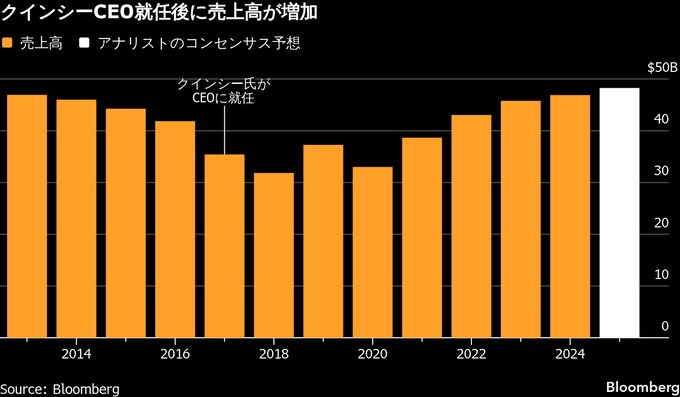 クインシー氏は2017年5月1日にCEOとなり、数年間に及ぶ販売低迷に陥っていた事業の立て直しに貢献した。同氏の就任後、株価は60%余り上昇。同期間のS&P500種株価指数は約190%超上げている。