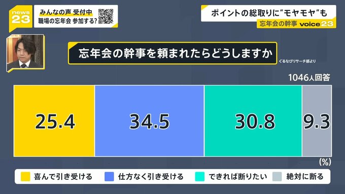 「忘年会の幹事を頼まれたらどうしますか?」。喜んで引き受けると答えた人は25%しかいませんでした。