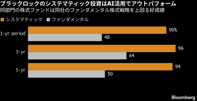 足元で、ブラックロックのシステマティック部門は好調だ。株式ファンドは9月までの時点で、過去5年間の約94%の期間で社内のベンチマークを上回った。ブラックロックの従来型アクティブ株式運用チームが市場を上回った割合は約半分にとどまる。