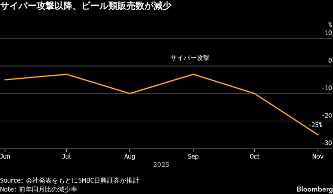 同社はサイバー攻撃を受けて、約2カ月にわたり受注・出荷業務を手作業で対応。10-11月の酒類の売上高は概算で前年同月比で1割超減った。サーバーへの侵入を検知する仕組みを導入していたものの防げなかったほか、回復に時間を要するなどシステムのぜい弱性が浮き彫りになっていた。