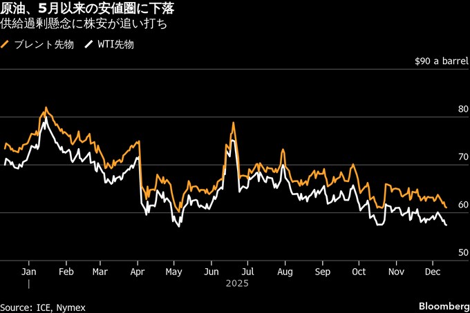 ウェスト・テキサス・インターミディエート(WTI)先物は1バレル=58ドルを下回り、5月以来の安値。ブレント先物は60ドルに向けて下落基調を強めている。心理的節目として意識される同水準を最後に割り込んだのは5月だ。