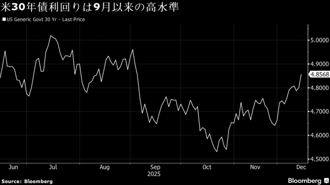 30年債利回りは一時6ベーシスポイント(bp)上昇の4.86%と、9月5日以来の高水準を付けた。一方、2年債利回りは低下。来年の追加利下げ期待が短期債を支援する一方、長期債はインフレの高止まりを反映している。