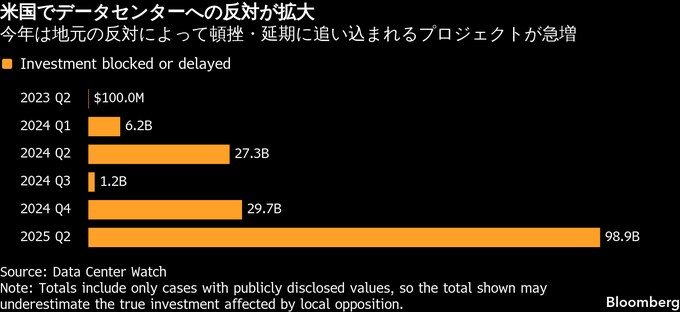 それでも草の根レベルでの不安は根強く、この点を考慮すべきなのは政治家にとどまらない。AIインテリジェンス企業10a Labsが運営するData Center Watchによれば、今年は地元の反対でデータセンター計画が阻止・延期される事例が急増している。調査では、4-6月期(第2四半期)に頓挫した投資額は980億ドル(約15兆2600億円)に達し、その規模は2023年以降の全四半期の累計を上回った。