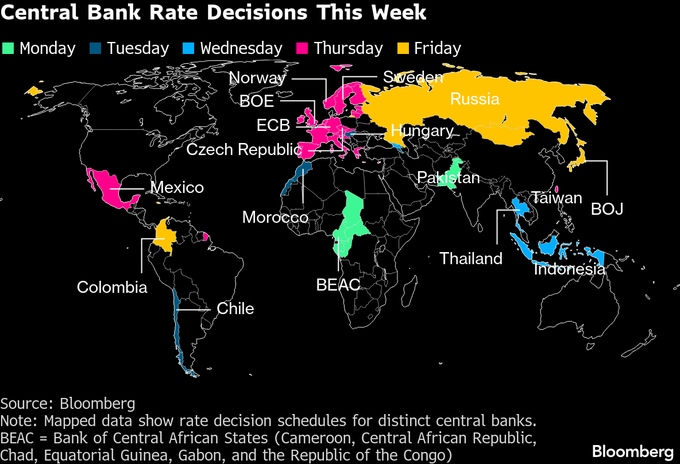他の欧州4カ国の中央銀行は金利据え置きが見込まれている。一方、日本銀行は利上げが広く予想されている。