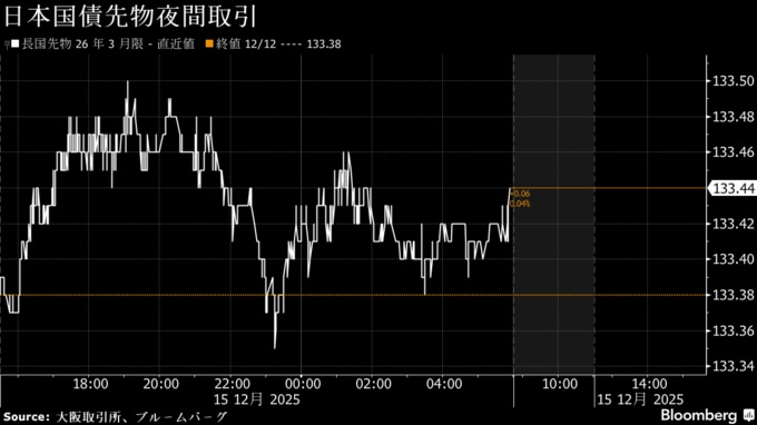 先物夜間取引で3月物は12日の日中取引終値比6銭高の133円44銭で終了した。12日の米10年債利回りは前日比3ベーシスポイント(bp、1bp=0.01%)高い4.18%程度で引けた。