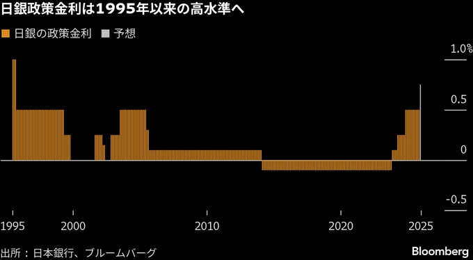 (ブルームバーグ):日本銀行は、今週の金融政策決定会合で政策金利を30年ぶりの水準に引き上げる見通しだ。昨年スタートした金融政策の正常化路線が新たな段階に入る。