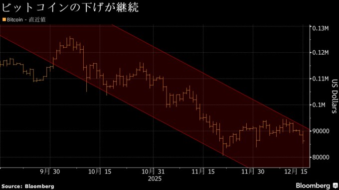 ビットコインは15日に一時3.7%安の8万5171ドルまで下落。その後は持ち直し、アジア時間の16日午前時点では8万6000ドル近辺で推移している。12万6000ドル超の過去最高値からは約30%下落している。