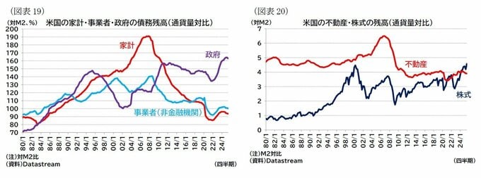 今回の株高が米国株に集中している要因も、ITバブルと比べても、AI関連企業が米国の一部企業に集中している(対照的にITバブル時は、各地域のインターネット網構築とサービス提供に各地域の企業が関与していた)ことに加えて、こうした米国の豊富な通貨量が株高を支えている可能性が考えられる。