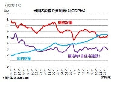 なお、AI関連技術は半導体製造などの最先端設備のほか、データセンター・電力などのインフラ投資など裾野が広いと見られることから、バブルが崩壊した場合には、バブル期に拡大した投資活動が停止し、その際の影響が大きくなる可能性がある(実際、ITバブル時は設備投資が急落した)。