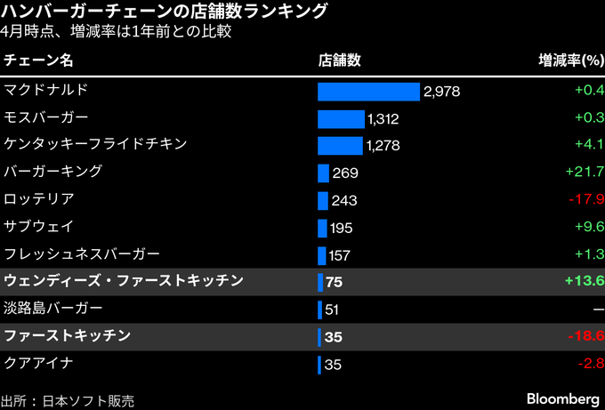 ウェンディーズ・ファーストキッチンの国内店舗数は、ファーストキッチンと合わせて108店舗。日本ソフト販売の集計によると、25年4月時点の国内トップはマクドナルド(2978店舗)、2位はモスバーガー(1312店舗)で、ウェンディーズ・ファーストキッチンは8位の規模となっている。