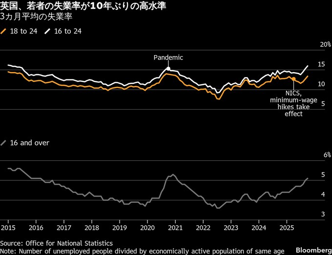 (ブルームバーグ):英国の若者の失業率が急上昇し、約10年ぶりの高水準となった。雇用市場減速の影響が、新たに参入する若年層に打撃を与えている。スターマー首相率いる労働党政権に対応を求める圧力が強まった。