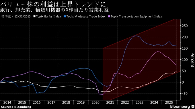 日本銀行による利上げ継続への期待がバリュー株の代表格である銀行株を押し上げている。11月以降、人工知能(AI)関連株が過剰投資への懸念で不安定化する中、自動車や資源、公益といったバリュー株への資金シフトも鮮明になっている。