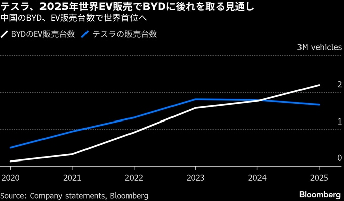 EVの台頭を世界で最も強く推進してきた米テスラも例外ではない。イーロン・マスク氏率いる同社は、2020年代初めに達成した急成長を維持できるとは限らなかったが、今は単なる減速ではなく、世界販売台数が2年連続で減少する見通しだ。マスク氏の関心は、2万5000ドル(約387万円)の低価格EVよりも、人型ロボットや自動運転タクシーの開発へと移っている。