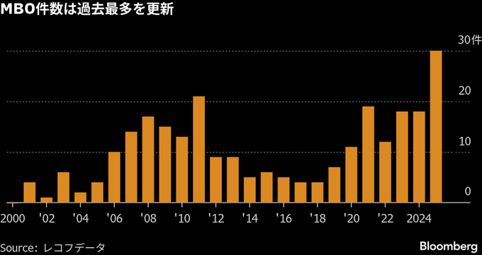 レコフデータによると、2025年に発表または報道されたMBO件数は30件と11年の21件を既に上回り、過去最多を更新している。市場では、アクティビストの動向を受け企業はより慎重なMBOの検討が求められるとの指摘がある半面、みずほ証の菊地氏は上場維持基準の厳格化などを背景に「今後もMBOは高水準が続くだろう」と予測している。