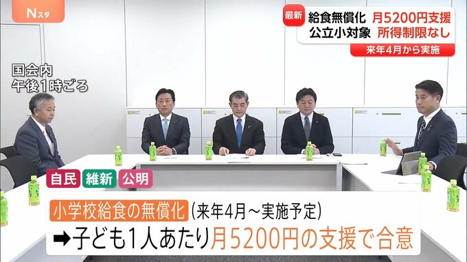 自民、維新の与党と公明党は来年4月から実施する予定の小学校給食の無償化について、子ども1人あたり月5200円を支援することで合意しました。公立小学校を対象に保護者の所得にかかわらず、一律で支援することにしています。