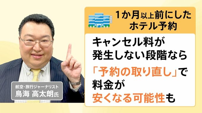 1か月以上前に高値の段階でホテル予約をしたという人もいると思いますが、航空・旅行ジャーナリストの鳥海高太朗氏によると、「キャンセル料が発生しない段階なら『予約の取り直し』で料金が安くなる可能性もある」ということです。