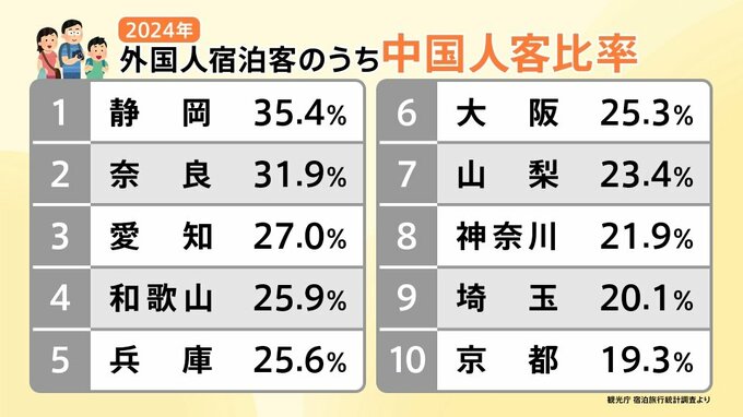 2024年の観光庁の宿泊旅行統計調査によると、外国人宿泊客のうち中国人客の比率が最も高いのは静岡県で35.4%、次いで奈良県で31.9%でした。