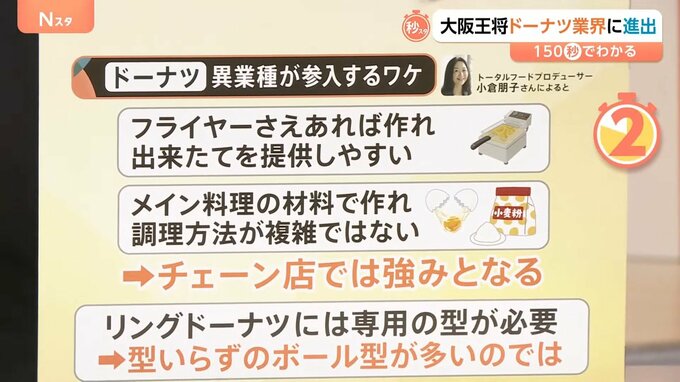 ドーナツに異業種が参入する理由は、▼フライヤーさえあれば作れて、出来立てを提供しやすいことや、▼メイン料理の材料で作ることができて、調理方法が複雑ではないため、チェーン店では強みになるということです。
