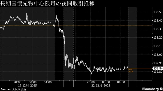 先物夜間取引で3月物は19日の日中取引終値比1銭安の132円84銭で終了した。19日の米10年債利回りは前日比3ベーシスポイント(bp、1bp=0.01%)高い4.15%程度で引けた。