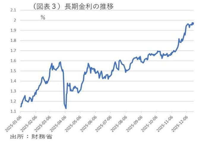 長期金利はいよいよ2%の大台に乗ろうとしている。約1年前の2024年末は1.11%だったので、そこから+1.0%近い上昇である。このピッチは早すぎる。