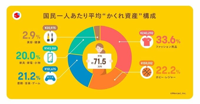 この「かくれ資産」の内訳を見ると、最も大きな割合を占めるのは「ファッション用品」(33.6%)で、次いで「ホビー・レジャー」(22.2%)、「書籍・音楽・ゲーム」(21.2%)、「家具・家電・小物」(20.0%)と続きます。
