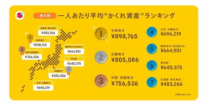 地域別に見ると、一人あたりの「かくれ資産」が最も多いのは中部地方で約90万円、次いで近畿地方で約81万円、中国・四国地方で約76万円となりました。