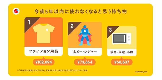 カテゴリー別に見ると、「ファッション用品」が最も多く約10万円、次いで「ホビー・レジャー」が約7万円、「家具・家電・小物」が約6万円となっています。